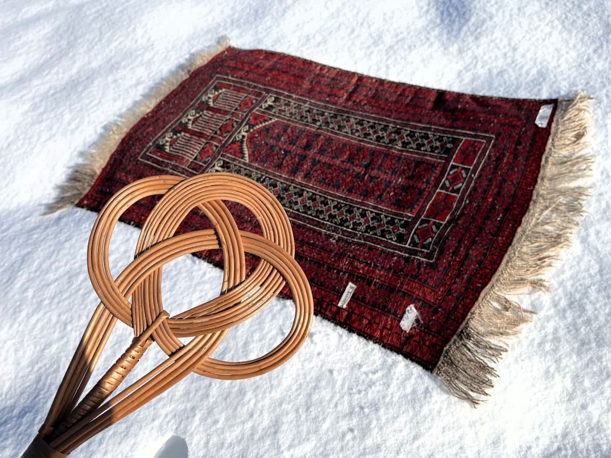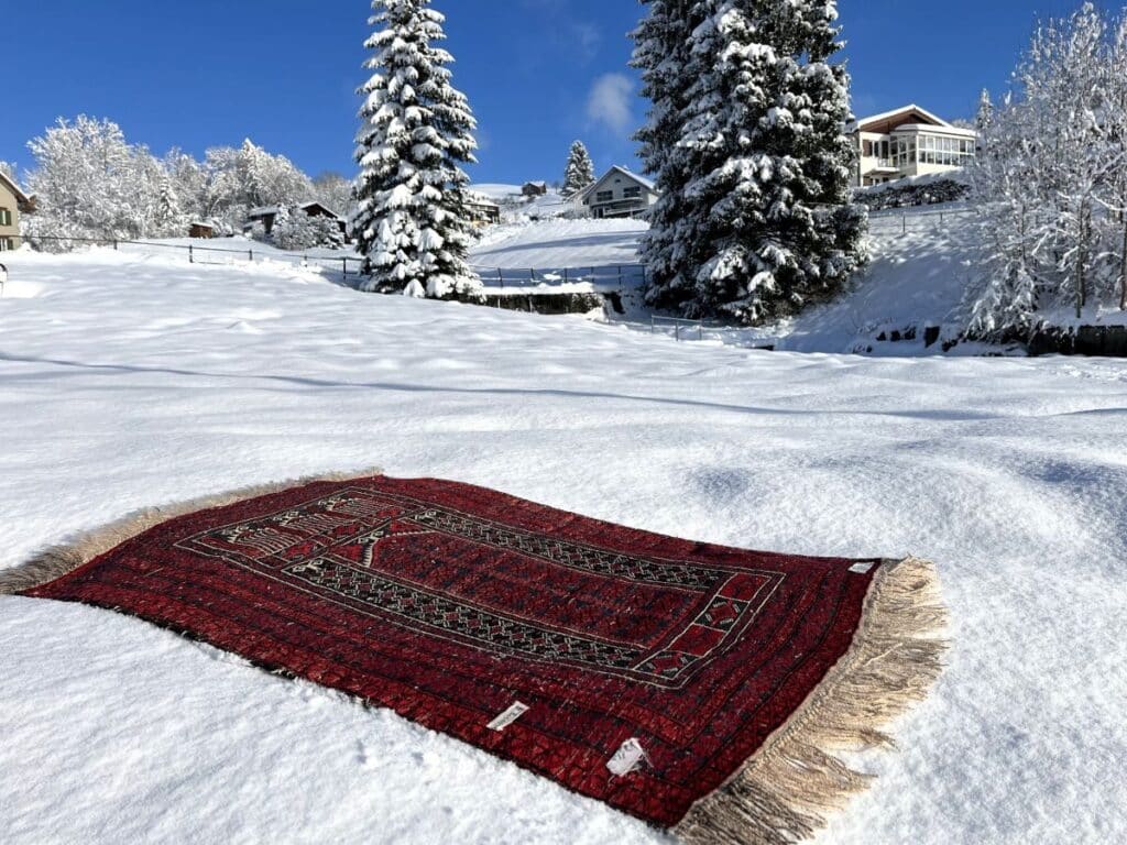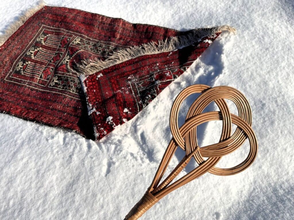 Früher, wenn der erste frische Pulverschnee fiel, war klar: Jetzt ist Zeit für die Teppichreinigung. Und zwar nicht mit Maschinen, sondern mit einer einfachen, aber wirkungsvollen Methode: Der Teppich wurde draussen in den Schnee gelegt – mit der Rückseite nach oben. Der saubere Neuschnee wirkte wie ein natürlicher Reiniger: Er zog Staub an und band Schmutzpartikel. Anschliessend wurde der Teppich mit einem klassischen Teppichklopfer aus Rattan kräftig ausgeklopft. Der gelöste Schmutz fiel direkt in den Schnee – sauber, schonend und effizient.